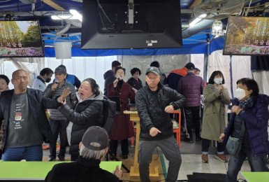 날이 꾸물꾸물하네요~기차소리와 술꾼들 소리 속 천막 예배당에는조용히 앉아 예배를 기다리는 분들이 가득합니다^^ 담..