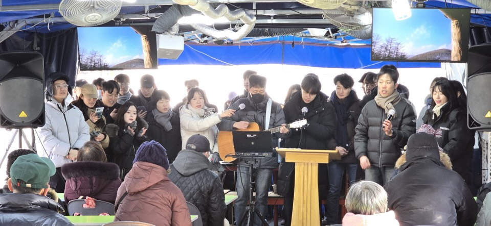 천막예배 특송과 배식봉사,